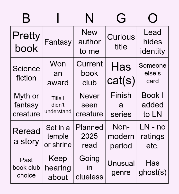 This bingo card has 25 words: Set in a temple or shrine, Going in clueless, Current book club, Past book club choice, Lead hides identity, Pretty book, Science fiction, Fantasy, Finish a series, Planned 2025 read, Has cat(s), Myth or fantasy creature, Non-modern period, LN - no ratings etc., Won an award, Has ghost(s), Book I added to LN, New author to me, Someone else‘s card, Title I didn’t understand, Never seen creature, Keep hearing about, Reread a story, Curious title and Unusual genre.
