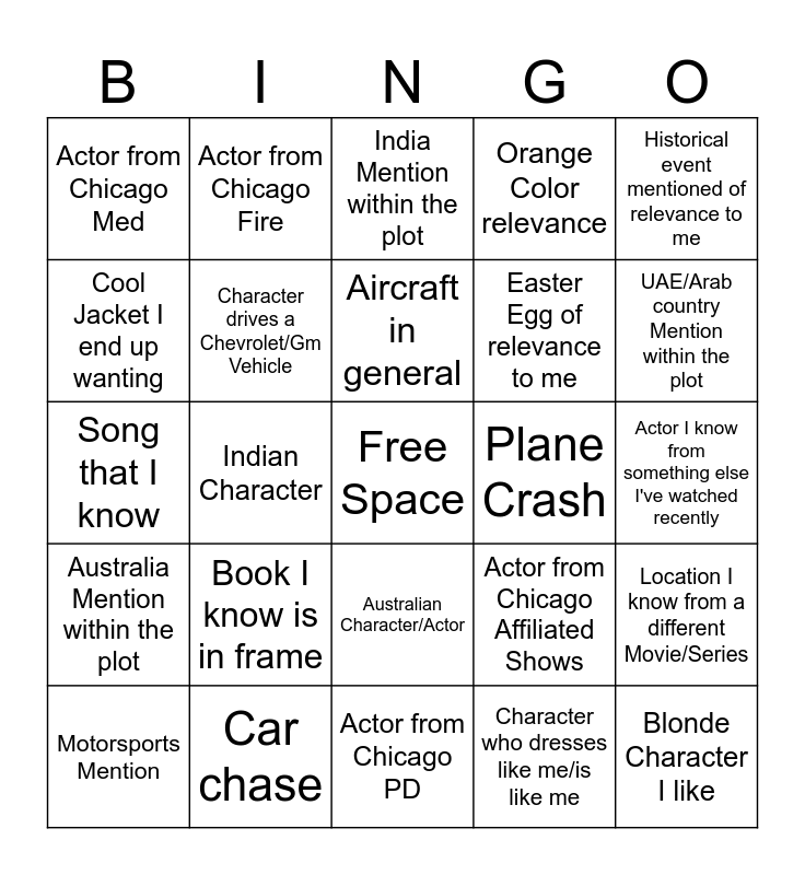 This bingo card has a free space and 24 words: Book I know is in frame, Car chase, Aircraft in general, Motorsports Mention, Historical event mentioned of relevance to me, Actor from Chicago Med, Cool Jacket I end up wanting, Actor from Chicago Fire, Plane Crash, Australian Character/Actor, Easter Egg of relevance to me, Song that I know, Actor from Chicago Affiliated Shows, Location I know from a different Movie/Series, Character drives a Chevrolet/Gm Vehicle, Character who dresses like me/is like me, Actor I know from something else I've watched recently, India Mention within the plot, UAE/Arab country Mention within the plot, Indian Character, Blonde Character I like, Australia Mention within the plot, Orange Color relevance and Actor from Chicago PD.