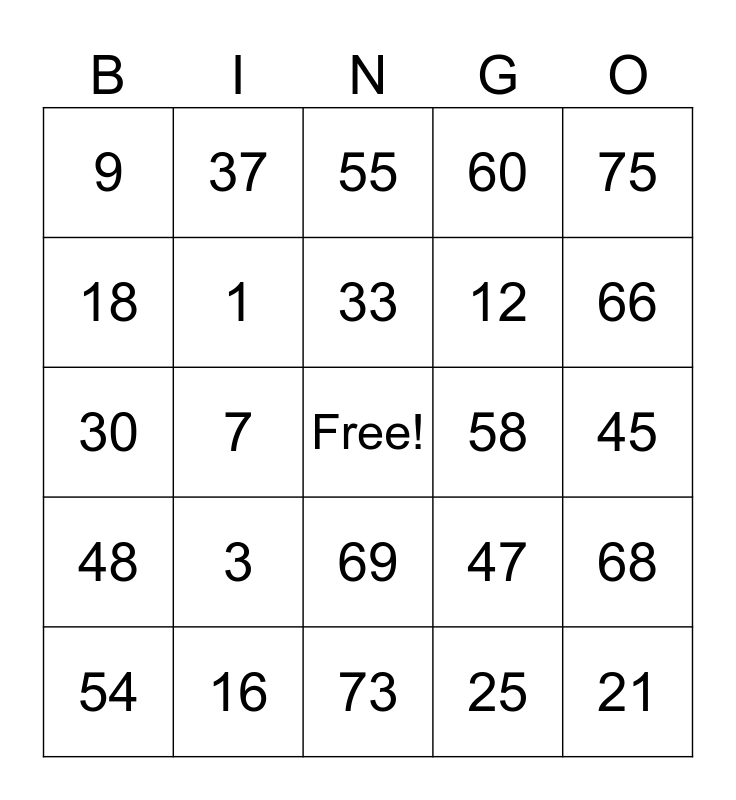 This bingo card has a free space and 24 words: 3, 16, 33, 54, 75, 9, 18, 37, 58, 69, 12, 30, 47, 68, 1, 25, 45, 55, 66, 7, 21, 48, 60 and 73.