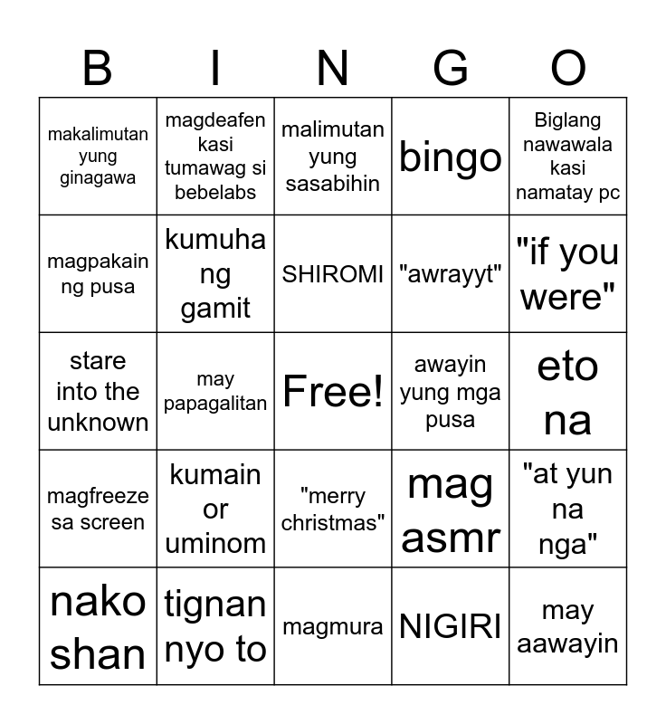 This bingo card has a free space and 24 words: nako shan, kumain or uminom, SHIROMI, NIGIRI, Biglang nawawala kasi namatay pc, makalimutan yung ginagawa, magdeafen kasi tumawag si bebelabs, malimutan yung sasabihin, awayin yung mga pusa, eto na, stare into the unknown, kumuha ng gamit, mag asmr, "at yun na nga", magpakain ng pusa, tignan nyo to, magmura, bingo, "if you were", magfreeze sa screen, may papagalitan, "merry christmas", "awrayyt" and may aawayin.