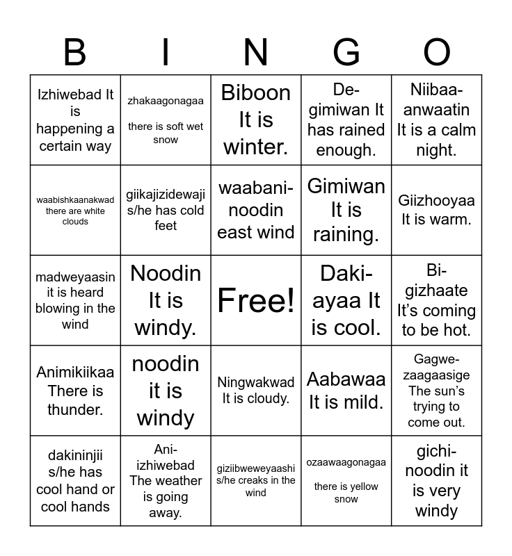 This bingo card has a free space and 70 words: Gichi-zoogipon It’s snowing a lot., Bi-gizhaate It’s coming to be hot., Bimi-gimiwan Rain is going by!, Mino-dakaanimad, Ani-izhiwebad The weather is going away., Dazhi-noodin It is windy there., De-gimiwan It has rained enough., Babaa-noodin Wind is going around., Niibaa-anwaatin It is a calm night., Ishkwaa-gimiwan, Gagwe-zaagaasige The sun’s trying to come out., Maajii-zoogipon, Izhiwebad It is happening a certain way, Biboon It is winter., Gisinaa It is cold., Noodin It is windy., Ningwakwad It is cloudy., Gimiwan It is raining., Mizhakwad It is a clear sky., Animikiikaa There is thunder., Daki-ayaa It is cool., Aabawaa It is mild., Giizhooyaa It is warm., Zoogipon It is snowing., niiskaadad it is bad weather, anwaatin it is calm weather, biisibiisaa there is light rain, mamaangipon there are big snowflakes, ozaawaagonagaa there is yellow snow, boonipon it stops snowing, the snow stops, zhakaagonagaa there is soft wet snow, mamaangibiisaa there are big drops of rain, dakibiisaa it is cold rain, baashkikwa'am s/he makes thunder., waawaate there is a display of the northern lights, waaseyaa it is sunny, aanakwadokaa there are (a lot of) clouds, makadewaanakwad it is a dark cloud, zegaanakwad there are storm clouds, waabishkaanakwad there are white clouds, ozhaashikwaa there is slippery ice, noodin it is windy, gichi-noodin it is very windy, nichiiwad there is a severe storm, dakizide h/ foot is chilled or cold, giikajizidewaji s/he has cold feet, dakininjii s/he has cool hand or cool hands, giikajininjiiwaji s/he has cool or cold hands, giikajindibewaji h/ head is cold, dakate it (a room or house) is cold, gizhaanimad it is a hot wind, dakaanimad it is a cold wind, dakaashi s/he is cooled by the wind, dakaasin it is cooled by the wind, giziibweweyaashi s/he creaks in the wind, giziibweweyaasin it creaks in the wind, waabani-noodin east wind, gizhiiyaanimad the wind blows fast, minwaanimad there is a good breeze, madweyaanimad it is audible wind, "you" can hear the wind, madweyaasin it is heard blowing in the wind, madweyaashi it (animate) is heard blowing in the wind, gizhaanimad it is a hot wind, ombaasin it is lifted by the wind; is blown, sails, soars upwards, ombaashi s/he or it (animate) is blown up in the air, giiwedin the north wind, zhaawani-noodin south wind, zhaawani-noodin there is a south wind, zegaanimad it is a fierce wind and ningaabii'an west.