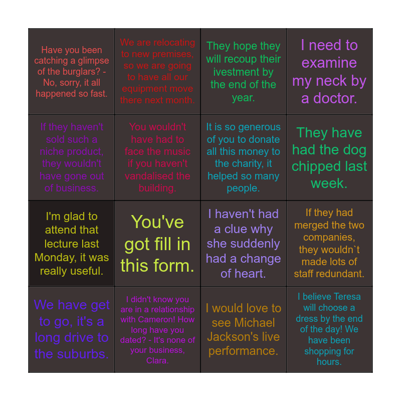 This bingo card has 16 words: I didn't know you are in a relationship with Cameron! How long have you dated? - It's none of your business, Clara., If they had merged the two companies, they wouldn`t made lots of staff redundant., They hope they will recoup their ivestment by the end of the year., Have you been catching a glimpse of the burglars? - No, sorry, it all happened so fast., I'm glad to attend that lecture last Monday, it was really useful., We are relocating to new premises, so we are going to have all our equipment move there next month., I haven't had a clue why she suddenly had a change of heart., I would love to see Michael Jackson's live performance., If they haven't sold such a niche product, they wouldn't have gone out of business., You wouldn't have had to face the music if you haven't vandalised the building., We have get to go, it's a long drive to the suburbs., I need to examine my neck by a doctor., You've got fill in this form., They have had the dog chipped last week., It is so generous of you to donate all this money to the charity, it helped so many people. and I believe Teresa will choose a dress by the end of the day! We have been shopping for hours..