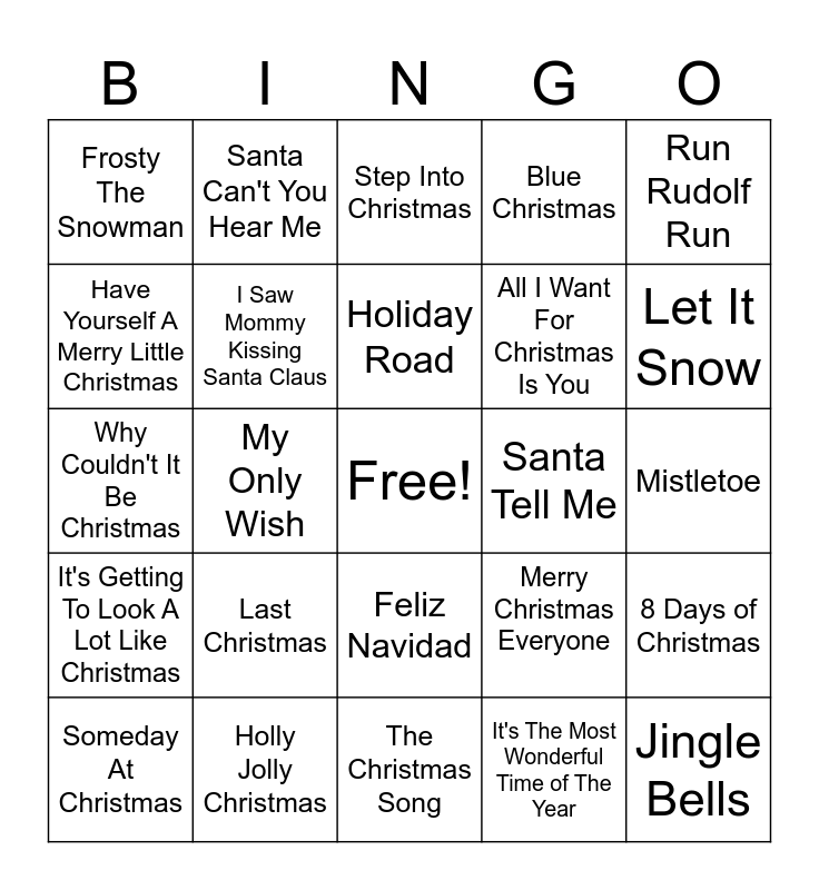 This bingo card has a free space and 24 words: Last Christmas, Holly Jolly Christmas, Holiday Road, Someday At Christmas, Run Rudolf Run, Frosty The Snowman, Have Yourself A Merry Little Christmas, Santa Can't You Hear Me, Santa Tell Me, Feliz Navidad, All I Want For Christmas Is You, Why Couldn't It Be Christmas, Merry Christmas Everyone, 8 Days of Christmas, I Saw Mommy Kissing Santa Claus, It's The Most Wonderful Time of The Year, Mistletoe, Step Into Christmas, Let It Snow, My Only Wish, Jingle Bells, It's Getting To Look A Lot Like Christmas, Blue Christmas and The Christmas Song.