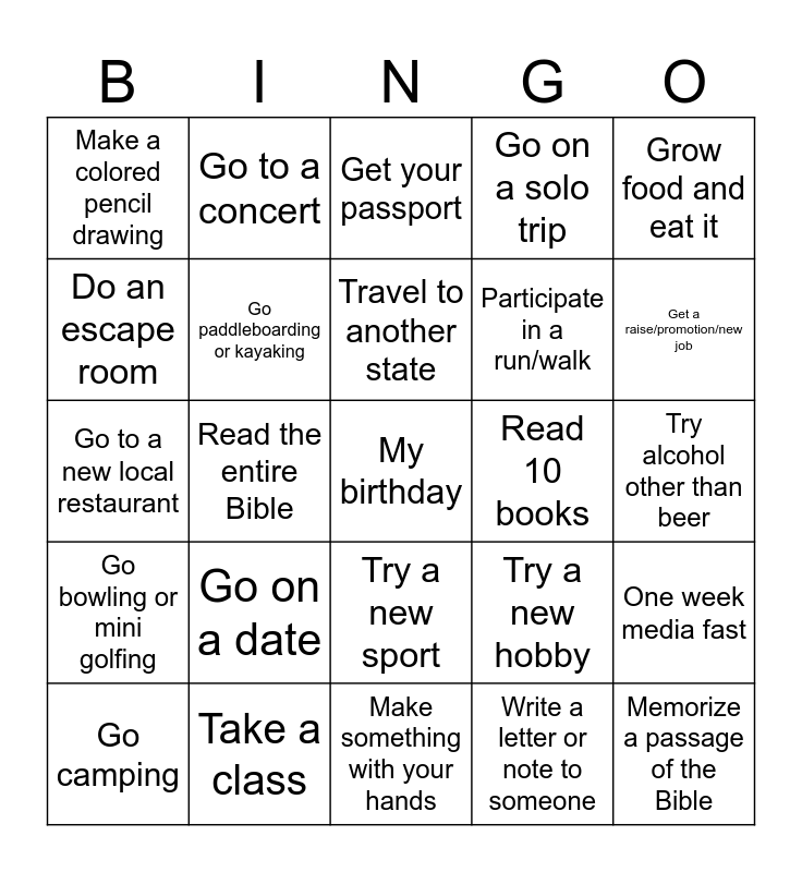 This bingo card has a free space and 24 words: Go on a date, Take a class, Travel to another state, Go camping, Grow food and eat it, Make a colored pencil drawing, Do an escape room, Go to a concert, Read 10 books, Try a new sport, Participate in a run/walk, Go to a new local restaurant, Try a new hobby, One week media fast, Go paddleboarding or kayaking, Write a letter or note to someone, Try alcohol other than beer, Get your passport, Get a raise/promotion/new job, Read the entire Bible, Memorize a passage of the Bible, Go bowling or mini golfing, Go on a solo trip and Make something with your hands.