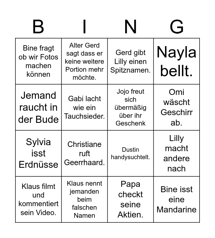 This bingo card has 32 words: Klaus sagt 'a la bon heure', Anni knackt ihren Nacken, Lilly macht andere nach, Rocco staunt mit offenem Mund, Bine isst eine Mandarine, Jojo freut sich übermäßig über ihr Geschenk, Jemand raucht in der Bude, Jemand staunt über die Anzahl der Geschenke, Alter Gerd sagt dass er keine weitere Portion mehr möchte., Die erste Flasche Sekt ist leer, Omi wäscht Geschirr ab., Gerd gibt Lilly einen Spitznamen., Gerd muss die Spritze von Christane einstellen., Dustin faltet Servietten, Klaus nennt jemanden beim falschen Namen, Alter Gerd erzählt Geschichten von früher., Anni bekleckert sich., Dustin handysuchtelt., Dustin googelt eine Antwort., Lilly ist genervt., Lilly trägt ihre Grinch-Hose, Papa ist schlecht gelaunt, Papa checkt seine Aktien., Jemand sagt 'Stimmung in der Bude', Klaus filmt und kommentiert sein Video., Nayla bellt., Sylvia isst Erdnüsse, Gabi lacht wie ein Tauchsieder., Bine fragt ob wir Fotos machen können, Jojo kuschelt mit Lilly, Gerhard isst Schlagsahne mit Kuchen and Christiane ruft Geerrhaard..