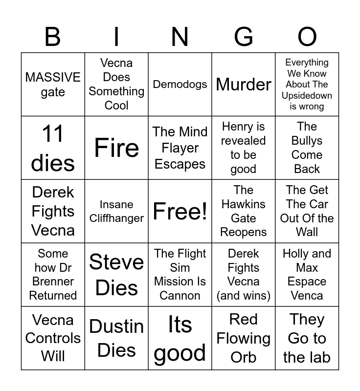 This bingo card has a free space and 24 words: Steve Dies, Dustin Dies, The Mind Flayer Escapes, Vecna Controls Will, Everything We Know About The Upsidedown is wrong, MASSIVE gate, 11 dies, Vecna Does Something Cool, The Hawkins Gate Reopens, The Flight Sim Mission Is Cannon, Henry is revealed to be good, Derek Fights Vecna, Derek Fights Vecna (and wins), Holly and Max Espace Venca, Fire, Red Flowing Orb, The Get The Car Out Of the Wall, Demodogs, The Bullys Come Back, Insane Cliffhanger, They Go to the lab, Some how Dr Brenner Returned, Murder and Its good.