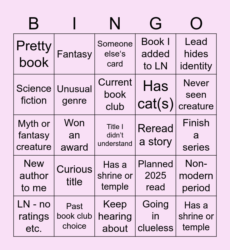 This bingo card has 26 words: Has a shrine or temple, Going in clueless, Current book club, Past book club choice, Lead hides identity, Pretty book, Science fiction, Fantasy, Finish a series, Planned 2025 read, Has cat(s), Myth or fantasy creature, Non-modern period, LN - no ratings etc., Won an award, Has ghost(s), Book I added to LN, New author to me, Someone else‘s card, Title I didn’t understand, Never seen creature, Keep hearing about, Reread a story, Curious title, Unusual genre and Has a shrine or temple.