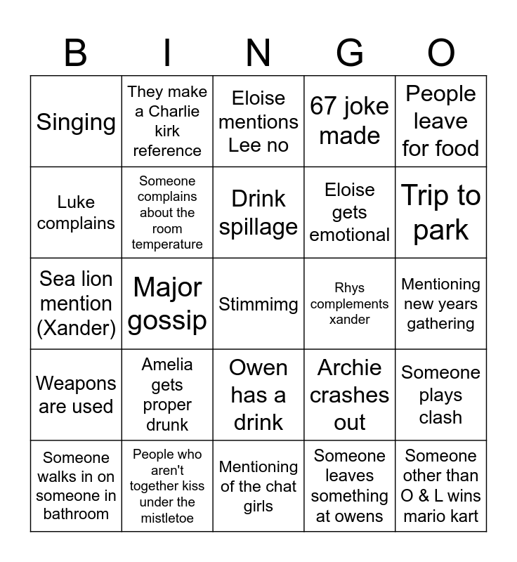 This bingo card has a free space and 24 words: Amelia gets proper drunk, People who aren't together kiss under the mistletoe, Drink spillage, Someone walks in on someone in bathroom, People leave for food, Singing, Luke complains, They make a Charlie kirk reference, Rhys complements xander, Owen has a drink, Eloise gets emotional, Sea lion mention (Xander), Archie crashes out, Someone plays clash, Someone complains about the room temperature, Someone leaves something at owens, Mentioning new years gathering, Eloise mentions Lee no, Trip to park, Major gossip, Someone other than O & L wins mario kart, Weapons are used, 67 joke made and Mentioning of the chat girls.