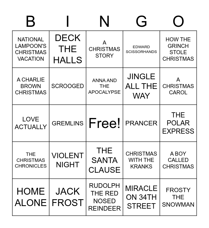 This bingo card has a free space and 29 words: HOME ALONE, DIE HARD, GREMLINS, ELF, NATIONAL LAMPOON'S CHRISTMAS VACATION, A CHRISTMAS STORY, SCROOGED, VIOLENT NIGHT, PRANCER, JACK FROST, THE POLAR EXPRESS, FROSTY THE SNOWMAN, RUDOLPH THE RED NOSED REINDEER, MIRACLE ON 34TH STREET, A CHRISTMAS CAROL, IT'S A WONDERFUL LIFE, THE SANTA CLAUSE, THE CHRISTMAS CHRONICLES, HOW THE GRINCH STOLE CHRISTMAS, LOVE ACTUALLY, CHRISTMAS WITH THE KRANKS, THE NIGHTMARE BEFORE CHRISTMAS, JINGLE ALL THE WAY, A CHARLIE BROWN CHRISTMAS, EDWARD SCISSORHANDS, DECK THE HALLS, A BOY CALLED CHRISTMAS, ANNA AND THE APOCALYPSE and RED ONE.