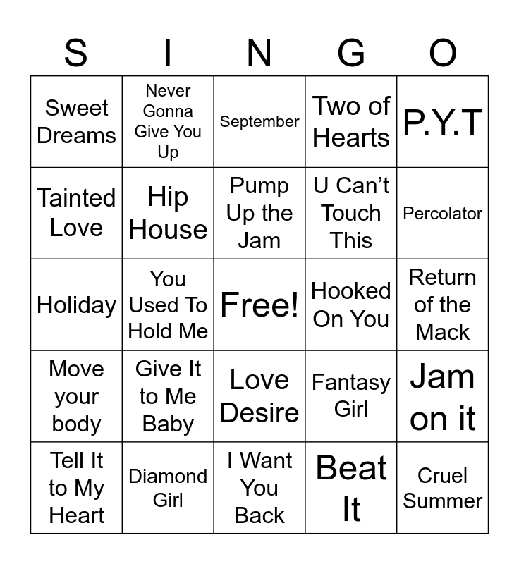 This bingo card has a free space and 45 words: Lady (Hear Me Tonight), Cruel Summer, Let’s Groove, Tell It to My Heart, Point of No Return, Beat It, September, Boogie Wonderland, P.Y.T, Diamond Girl, Two of Hearts, Hooked On You, Love Desire, Give It to Me Baby, Super Freak, I Want You Back, Canned Heat, Holiday, Spring Love, Percolator, Never Gonna Give You Up, Silent Morning, When I Hear Music, Sweet Dreams, Hot Stuff, Return of the Mack, I wanna Dance with Somebody, Got to Be Real, Fantasy Girl, Move your body, Love can’t turn around, Jam on it, Get Get Down, Welcome To My Groove, Don’t Stop ‘Til You Get Enough, You Used To Hold Me, Take Me In Your Arms, Change On Me, Brighter Days, Pump Up the Jam, Tainted Love, U Can’t Touch This, Love Like This, Hip House and Booty Call.