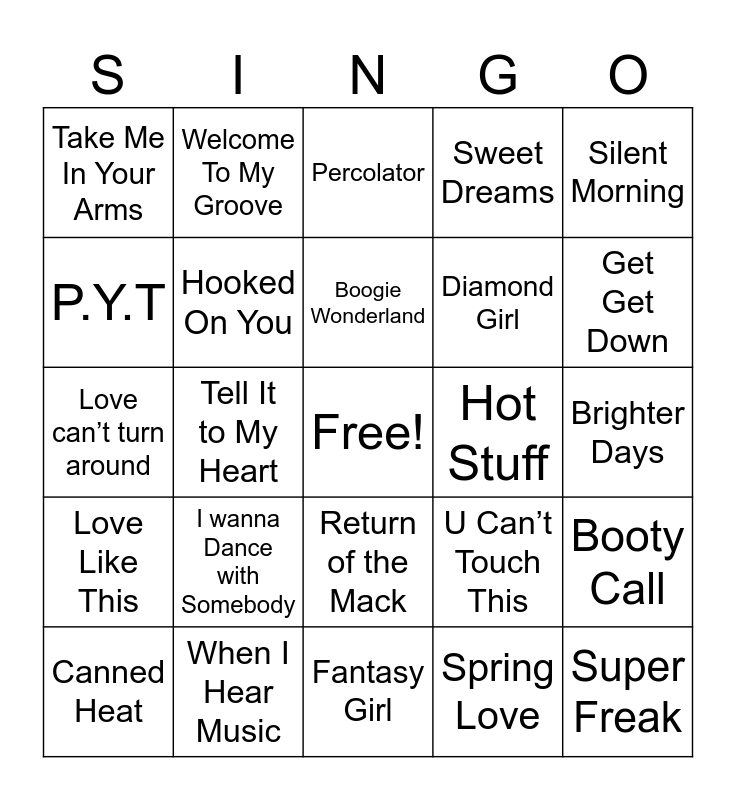 This bingo card has a free space and 45 words: Give It to Me Baby, Super Freak, I Want You Back, Canned Heat, Holiday, Spring Love, Percolator, Never Gonna Give You Up, Silent Morning, When I Hear Music, Sweet Dreams, Hot Stuff, Return of the Mack, I wanna Dance with Somebody, Got to Be Real, Fantasy Girl, Move your body, Love can’t turn around, Jam on it, Get Get Down, Welcome To My Groove, Don’t Stop ‘Til You Get Enough, You Used To Hold Me, Take Me In Your Arms, Change On Me, Brighter Days, Pump Up the Jam, Tainted Love, U Can’t Touch This, Love Like This, Hip House, Booty Call, Lady (Hear Me Tonight), Cruel Summer, Let’s Groove, Tell It to My Heart, Point of No Return, Beat It, September, Boogie Wonderland, P.Y.T, Diamond Girl, Two of Hearts, Hooked On You and Love Desire.