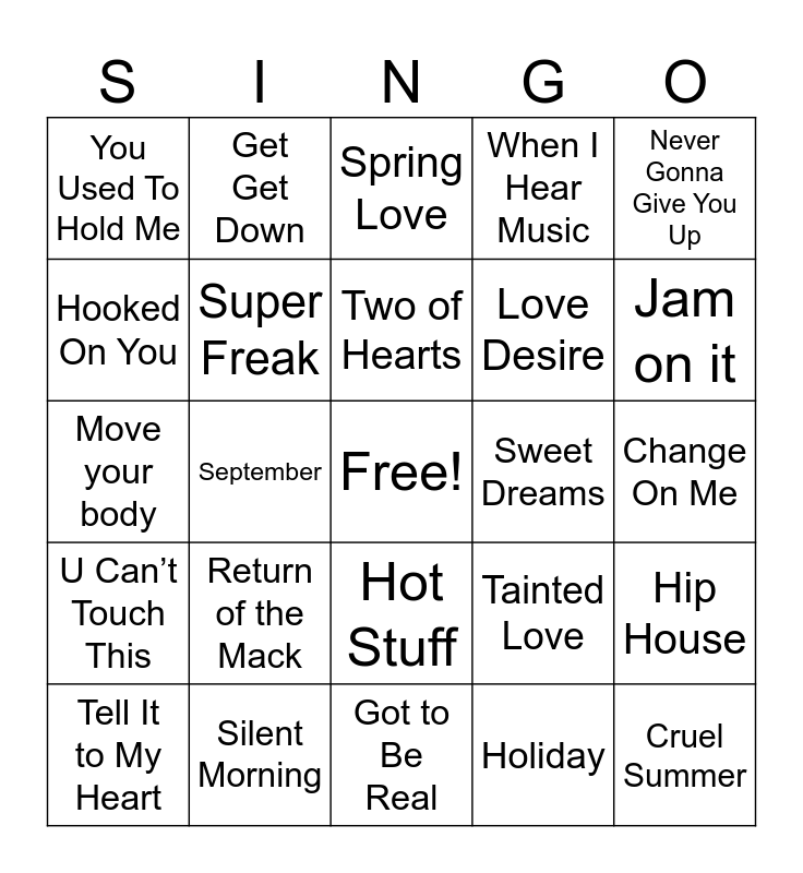 This bingo card has a free space and 45 words: Lady (Hear Me Tonight), Cruel Summer, Let’s Groove, Tell It to My Heart, Canned Heat, Holiday, Spring Love, Percolator, Never Gonna Give You Up, Silent Morning, When I Hear Music, Sweet Dreams, Hot Stuff, Return of the Mack, I wanna Dance with Somebody, Got to Be Real, Fantasy Girl, Move your body, Love can’t turn around, Jam on it, Get Get Down, Welcome To My Groove, Don’t Stop ‘Til You Get Enough, You Used To Hold Me, Take Me In Your Arms, Change On Me, Brighter Days, Pump Up the Jam, Tainted Love, U Can’t Touch This, Love Like This, Hip House, Booty Call, Point of No Return, Beat It, September, Boogie Wonderland, P.Y.T, Diamond Girl, Two of Hearts, Hooked On You, Love Desire, Give It to Me Baby, Super Freak and I Want You Back.