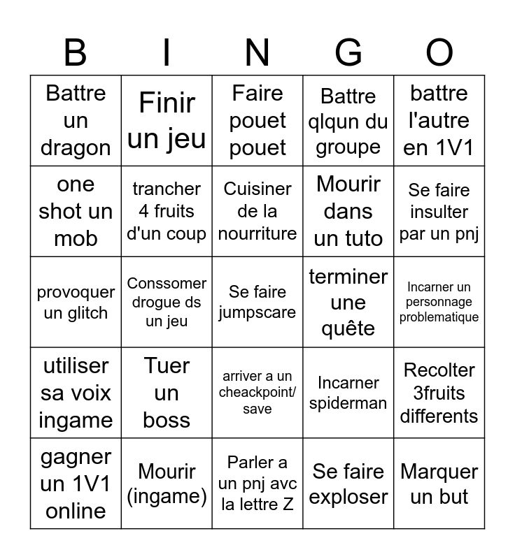 This bingo card has a free space and 24 words: Tuer un boss, Mourir (ingame), Cuisiner de la nourriture, gagner un 1V1 online, battre l'autre en 1V1, Battre un dragon, one shot un mob, Finir un jeu, terminer une quête, arriver a un cheackpoint/ save, Mourir dans un tuto, provoquer un glitch, Incarner spiderman, Recolter 3fruits differents, trancher 4 fruits d'un coup, Se faire exploser, Incarner un personnage problematique, Faire pouet pouet, Se faire insulter par un pnj, Conssomer drogue ds un jeu, Marquer un but, utiliser sa voix ingame, Battre qlqun du groupe and Parler a un pnj avc la lettre Z.