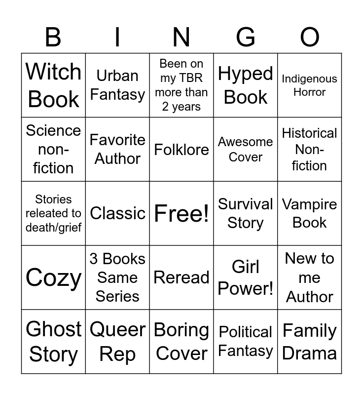 This bingo card has a free space and 24 words: 3 Books Same Series, Queer Rep, Folklore, Ghost Story, Indigenous Horror, Witch Book, Science non-fiction, Urban Fantasy, Survival Story, Reread, Awesome Cover, Stories releated to death/grief, Girl Power!, New to me Author, Favorite Author, Political Fantasy, Vampire Book, Been on my TBR more than 2 years, Historical Non-fiction, Classic, Family Drama, Cozy, Hyped Book and Boring Cover.