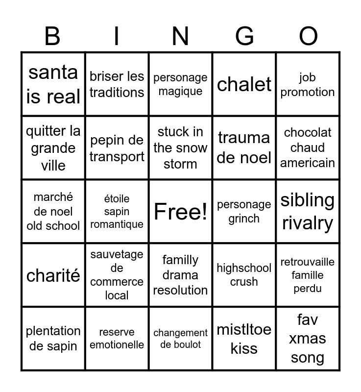 This bingo card has a free space and 27 words: highschool crush, parent mort, trauma de noel, changement de boulot, quitter la grande ville, personage magique, briser les traditions, charité, personage grinch, retrouvaille famille perdu, marché de noel old school, chalet, plentation de sapin, reserve emotionelle, chocolat chaud americain, recette famillial, pepin de transport, stuck in the snow storm, sauvetage de commerce local, santa is real, sibling rivalry, mistltoe kiss, étoile sapin romantique, fav xmas song, familly drama resolution, job promotion and new career.