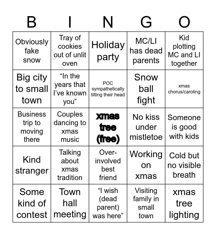 This bingo card has a free space and 54 words: Old man w/white beard, Kind stranger, Small town, Biracial child, Over-involved best friend, Some kind bakery, MC/LI has dead parents, Newly-moved person, Big city to small town, Emotionally unavailable MC/LI, Obviously fake snow, Whole town gathered at the end, Town hall meeting, Some kind of contest, Holiday festival, “I wish (dead parent) was here”, xmas tree lighting, Snow ball fight, Snowfall in last scene, Someone is good with kids, Working on xmas, Snowfall on a kiss scene, No kiss under mistletoe, Kid plotting MC and LI together, divorced/widowed MC/LI, Tray of cookies out of unlit oven, Family recipe, Local business about to close down, Long gaze between MC and LI, Visiting family in small town, “Big city girl/boy, miscommunication between MC and LI, Lack of xmas spirit in MC/LI, “Haven’t seen you around here”, Holiday party, Black best friend, Business trip to moving there, Cold but no visible breath, Fundraiser, “In the years that I’ve known you”, Workaholic, xmas tree shopping, Sitting on a bench outside, Performing xmas tradition, Talking about xmas tradition, Kissing under the mistletoe, Snow storm, Product placement, POC sympathetically tilting their head, Couples dancing to xmas music, xmas chorus/caroling, MC/LI wearing a hat outside when it’s cold, Almost kiss and MC/LI mistaken for a couple.