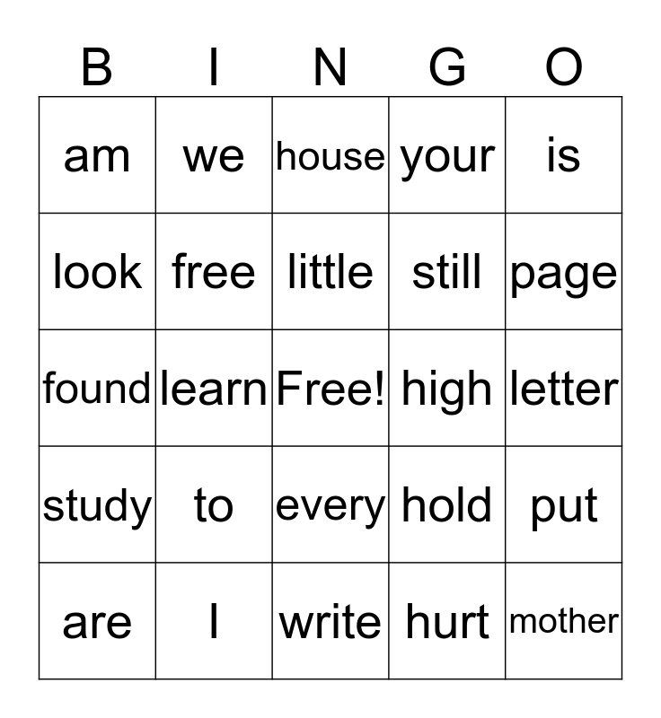 This bingo card has a free space and 24 words: to, I, little, are, is, am, look, we, high, every, still, found, hold, put, free, hurt, letter, house, page, learn, mother, study, your and write.