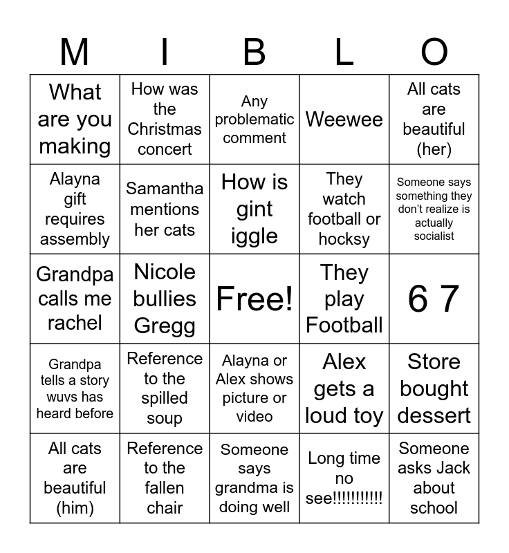This bingo card has a free space and 24 words: Reference to the spilled soup, Reference to the fallen chair, How is gint iggle, All cats are beautiful (him), All cats are beautiful (her), What are you making, Alayna gift requires assembly, How was the Christmas concert, They play Football, Alayna or Alex shows picture or video, They watch football or hocksy, Grandpa calls me rachel, Alex gets a loud toy, Store bought dessert, Samantha mentions her cats, Long time no see!!!!!!!!!!!, 6 7, Any problematic comment, Someone says something they don’t realize is actually socialist, Nicole bullies Gregg, Someone asks Jack about school, Grandpa tells a story wuvs has heard before, Weewee and Someone says grandma is doing well.