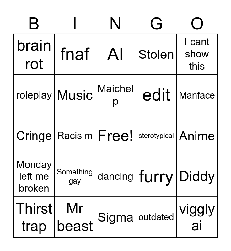 This bingo card has a free space and 24 words: Something gay, Mr beast, Maichel p, Thirst trap, I cant show this, brain rot, roleplay, fnaf, sterotypical, dancing, edit, Cringe, furry, Diddy, Music, outdated, Anime, AI, Manface, Racisim, viggly ai, Monday left me broken, Stolen and Sigma.