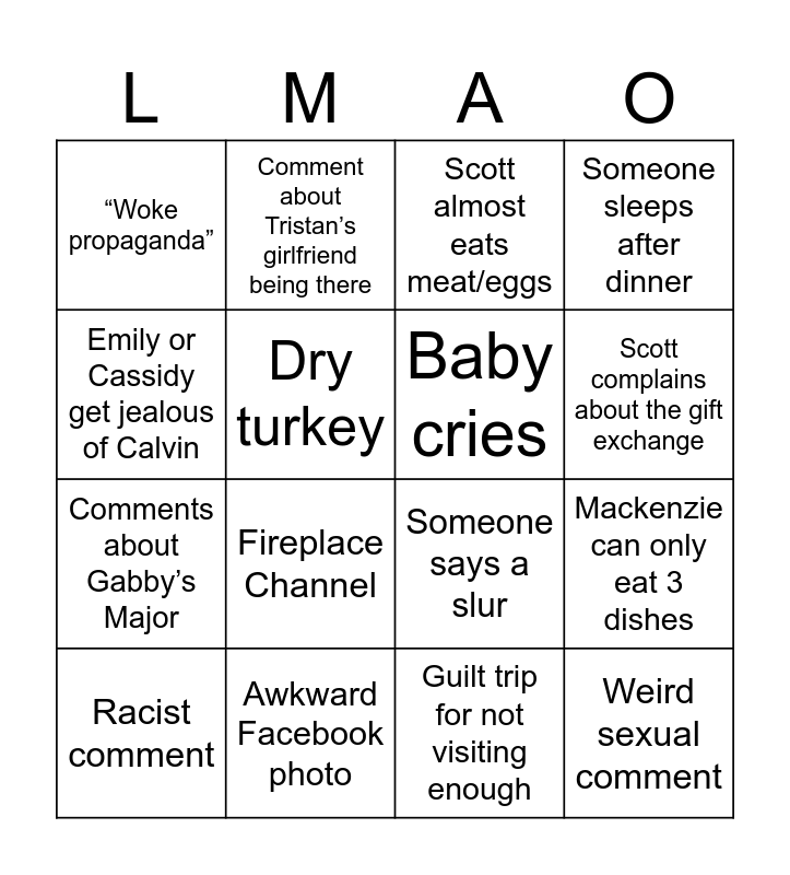 This bingo card has 16 words: Awkward Facebook photo, Mackenzie can only eat 3 dishes, Scott almost eats meat/eggs, “Woke propaganda”, Comments about Gabby’s Major, Comment about Tristan’s girlfriend being there, Someone says a slur, Guilt trip for not visiting enough, Emily or Cassidy get jealous of Calvin, Dry turkey, Racist comment, Someone sleeps after dinner, Fireplace Channel, Scott complains about the gift exchange, Baby cries and Weird sexual comment.