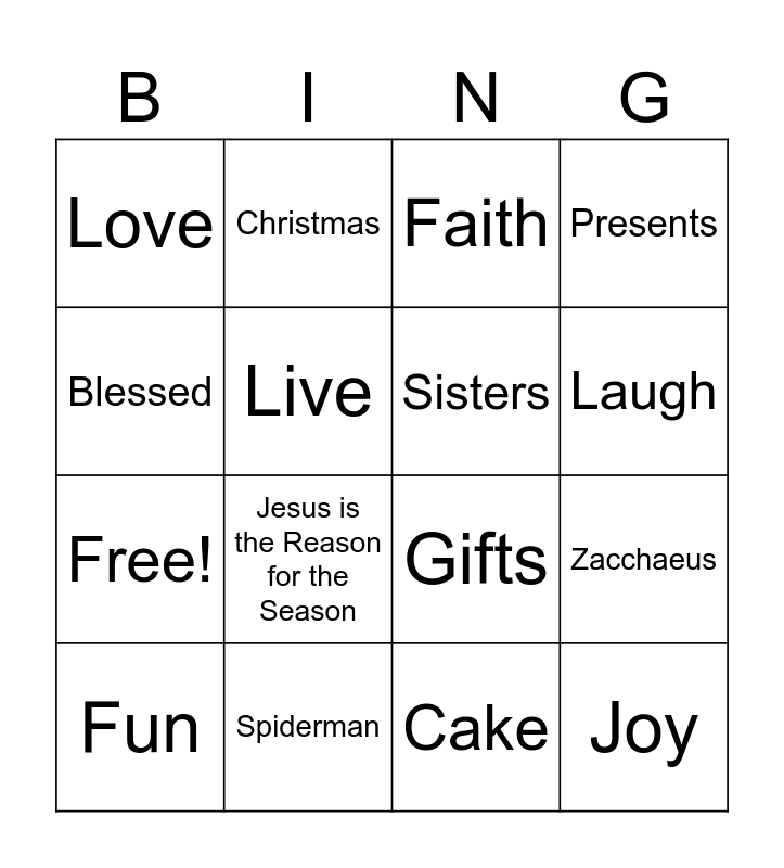 This bingo card has 20 words: Zacchaeus, Happy Birthday, Faith, Family, Fun, Blessed, Spiderman, Love, Free!, Christmas, Jesus is the Reason for the Season, Gifts, Live, Joy, Sisters, 5 yrs old, Laugh, Presents, Cake and Ice cream.