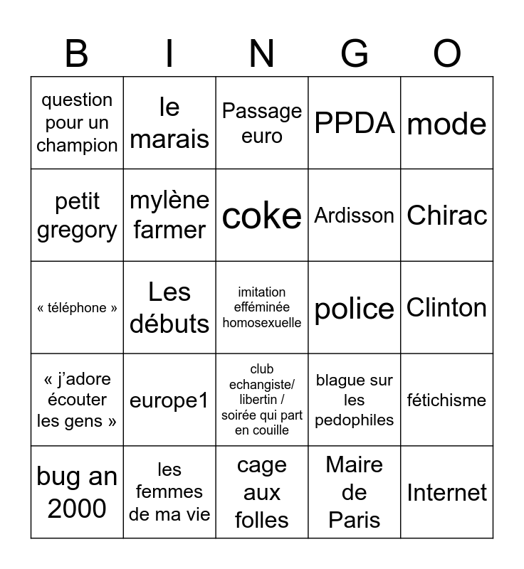 This bingo card has a free space and 24 words: europe1, les femmes de ma vie, coke, bug an 2000, mode, question pour un champion, petit gregory, le marais, police, club echangiste/ libertin / soirée qui part en couille, Ardisson, « téléphone », blague sur les pedophiles, fétichisme, mylène farmer, Maire de Paris, Clinton, Passage euro, Chirac, Les débuts, Internet, « j’adore écouter les gens », PPDA and cage aux folles.