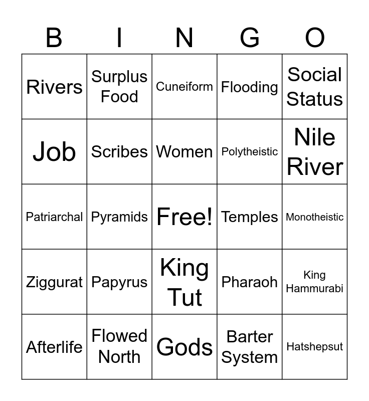 This bingo card has a free space and 27 words: Pharaoh, Nomadic, Polytheistic, Gods, Job, Cuneiform, Surplus Food, Ziggurat, Temples, King Hammurabi, Patriarchal, Flooding, Afterlife, Flowed North, Nile River, Fertile Crescent, Scribes, Women, Papyrus, Rivers, Monotheistic, Barter System, Pyramids, Hatshepsut, King Tut, Social Status and Khufu.