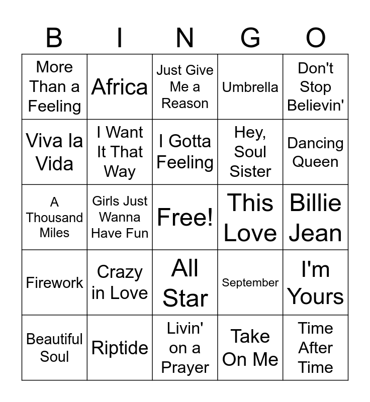 This bingo card has a free space and 24 words: Crazy in Love, Riptide, I Gotta Feeling, Beautiful Soul, Don't Stop Believin', More Than a Feeling, Viva la Vida, Africa, This Love, All Star, Hey, Soul Sister, A Thousand Miles, September, I'm Yours, I Want It That Way, Take On Me, Billie Jean, Just Give Me a Reason, Dancing Queen, Girls Just Wanna Have Fun, Time After Time, Firework, Umbrella and Livin' on a Prayer.