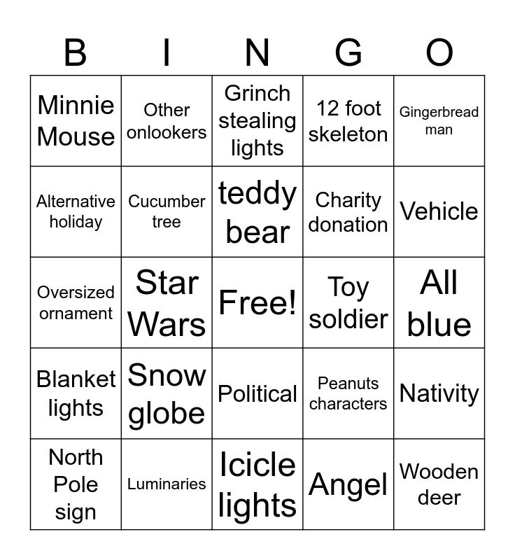 This bingo card has a free space and 31 words: Icicle lights, > 3 inflatables, Star Wars, Mickey Mouse, Minnie Mouse, Grinch stealing lights, Cucumber tree, Peanuts characters, Toy soldier, Angel, All blue, Wooden deer, > 2 projectors, Music show, Vehicle, Santa’s sleigh, Nativity, Snow globe, Blanket lights, Political, Gingerbread man, Penguin, North Pole sign, Other onlookers, Charity donation, Alternative holiday, 12 foot skeleton, Oversized ornament, Luminaries, teddy bear and Sports.