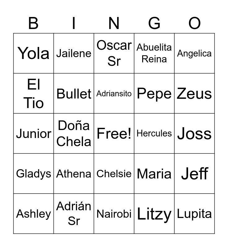 This bingo card has a free space and 26 words: Chelsie, Litzy, Adriansito, Adrián Sr, Angelica, Yola, El Tio, Jailene, Joss, Maria, Pepe, Junior, Jeff, Ashley, Doña Chela, Abuelito Pepe, Abuelita Reina, Gladys, Oscar Sr, Lupita, Zeus, Nairobi, Hercules, Athena, Bullet and Panther.