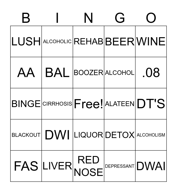 This bingo card has a free space and 24 words: DWI, LIVER, BOOZER, FAS, WINE, LUSH, AA, ALCOHOLIC, ALATEEN, LIQUOR, ALCOHOL, BINGE, DETOX, ALCOHOLISM, BAL, DEPRESSANT, DT'S, REHAB, .08, CIRRHOSIS, DWAI, BLACKOUT, BEER and RED NOSE.