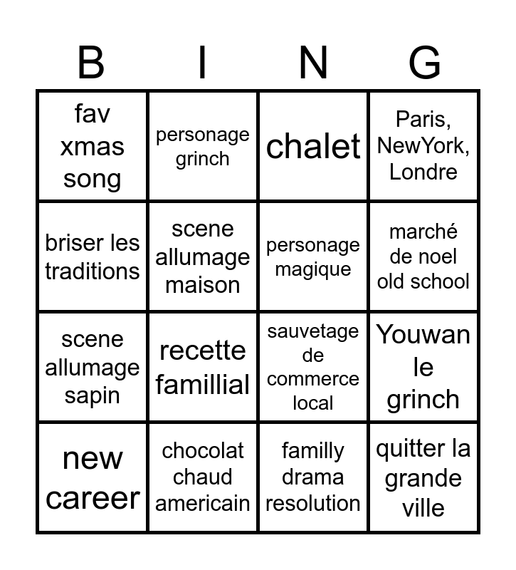 This bingo card has 34 words: Free!, old crush, parent mort, trauma de noel, quitter la grande ville, personage magique, briser les traditions, charité, personage grinch, retrouvaille famille perdu, marché de noel old school, chalet, plentation de sapin, reserve emotionelle, chocolat chaud americain, recette famillial, gros pepin de transport, sauvetage de commerce local, pere noel existe, sibling rivalry, mistltoe kiss, étoile sapin romantique, fav xmas song, familly drama resolution, job promotion, new career, Paris, NewYork, Londre, xmas song rock remix, scene allumage sapin, scene allumage maison, scene pain d'epice, Youwan le grinch, oracle de noel and Ranch.