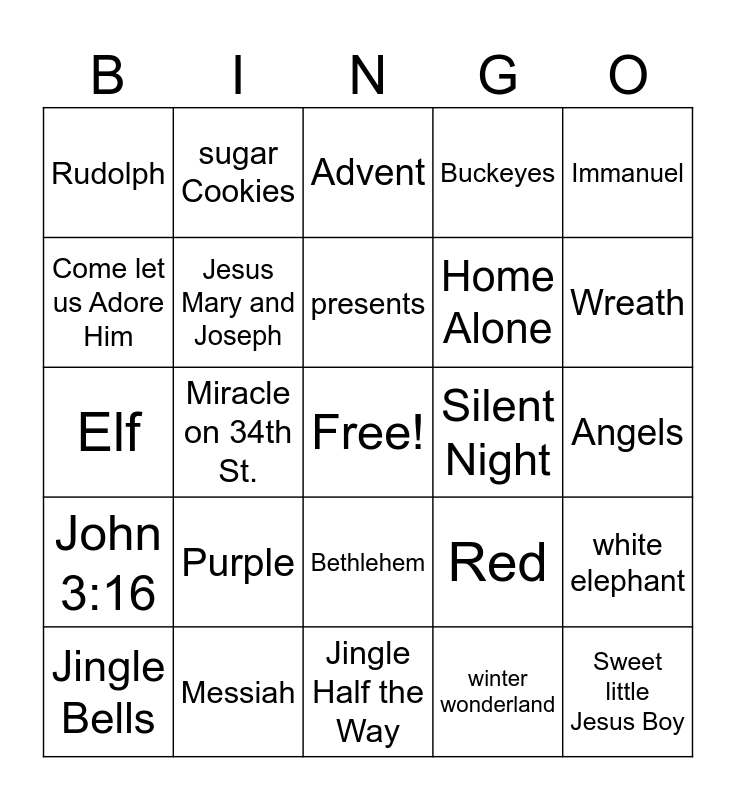 This bingo card has a free space and 29 words: Jingle Bells, Oh Holy Night, Miracle on 34th St., Joy to the World, Rudolph, Advent, Jesus Mary and Joseph, Purple, Silent Night, Messiah, Angels, Sweet little Jesus Boy, Jingle Half the Way, winter wonderland, Wreath, Baby Jesus, Bethlehem, John 3:16, Immanuel, Elf, Red, Green, Home Alone, Come let us Adore Him, Buckeyes, sugar Cookies, white elephant, presents and "The spirit of giving".