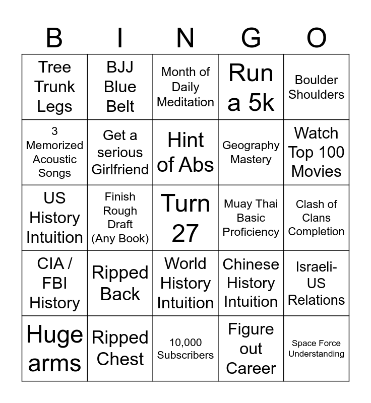 This bingo card has a free space and 24 words: Ripped Back, Ripped Chest, Hint of Abs, Huge arms, Boulder Shoulders, Tree Trunk Legs, 3 Memorized Acoustic Songs, BJJ Blue Belt, Muay Thai Basic Proficiency, World History Intuition, Geography Mastery, US History Intuition, Chinese History Intuition, Israeli-US Relations, Get a serious Girlfriend, Figure out Career, Clash of Clans Completion, Month of Daily Meditation, Watch Top 100 Movies, Finish Rough Draft (Any Book), Space Force Understanding, CIA / FBI History, Run a 5k and 10,000 Subscribers.