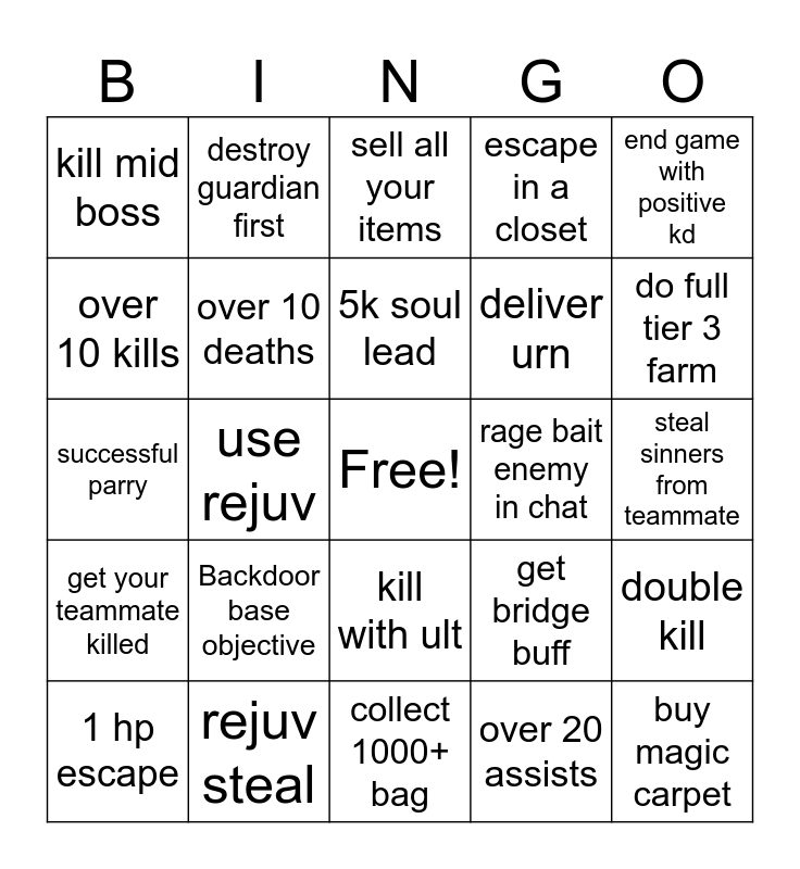 This bingo card has a free space and 24 words: Backdoor base objective, rejuv steal, 5k soul lead, 1 hp escape, end game with positive kd, kill mid boss, over 10 kills, destroy guardian first, rage bait enemy in chat, kill with ult, deliver urn, successful parry, get bridge buff, double kill, over 10 deaths, over 20 assists, steal sinners from teammate, sell all your items, do full tier 3 farm, use rejuv, buy magic carpet, get your teammate killed, escape in a closet and collect 1000+ bag.