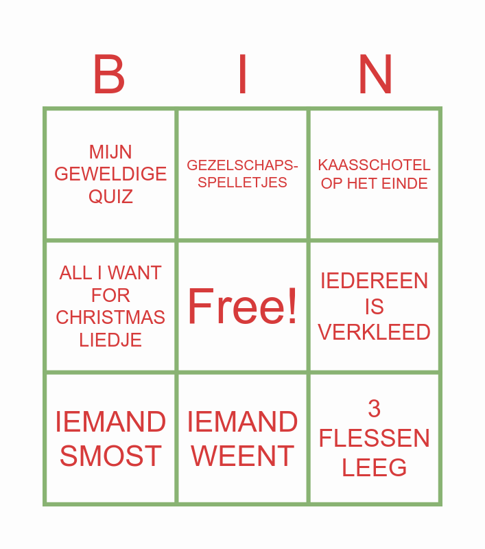 This bingo card has a free space and 11 words: 4+ RONDEN HAPJES, MATEO ZEGT ALLES IS GOED, IEDEREEN IS VERKLEED, IEMAND SMOST, KAASSCHOTEL OP HET EINDE, MIJN GEWELDIGE QUIZ, IEMAND WEENT, PAPIE DRINKT JENEVER, ALL I WANT FOR CHRISTMAS LIEDJE, GEZELSCHAPS- SPELLETJES and 3 FLESSEN LEEG.