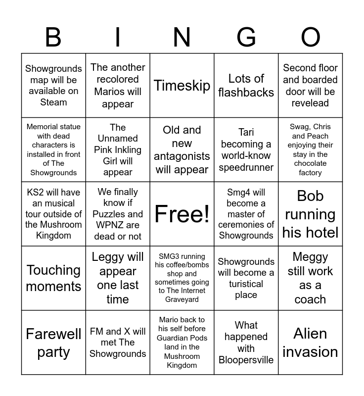 This bingo card has a free space and 24 words: Leggy will appear one last time, FM and X will met The Showgrounds, Old and new antagonists will appear, Farewell party, Second floor and boarded door will be revelead, Showgrounds map will be available on Steam, Memorial statue with dead characters is installed in front of The Showgrounds, The another recolored Marios will appear, Smg4 will become a master of ceremonies of Showgrounds, SMG3 running his coffee/bombs shop and sometimes going to The Internet Graveyard, Tari becoming a world-know speedrunner, KS2 will have an musical tour outside of the Mushroom Kingdom, Showgrounds will become a turistical place, Meggy still work as a coach, The Unnamed Pink Inkling Girl will appear, What happened with Bloopersville, Bob running his hotel, Timeskip, Swag, Chris and Peach enjoying their stay in the chocolate factory, We finally know if Puzzles and WPNZ are dead or not, Alien invasion, Touching moments, Lots of flashbacks and Mario back to his self before Guardian Pods land in the Mushroom Kingdom.