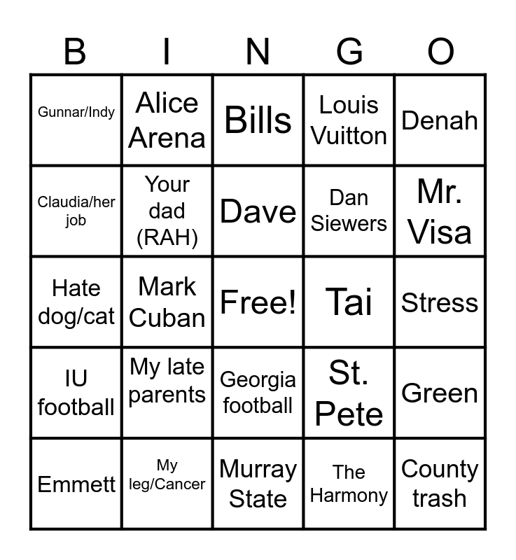 This bingo card has a free space and 24 words: My late parents, My leg/Cancer, Dave, Emmett, Denah, Gunnar/Indy, Claudia/her job, Alice Arena, Tai, Georgia football, Dan Siewers, Hate dog/cat, St. Pete, Green, Your dad (RAH), The Harmony, Stress, Bills, Mr. Visa, Mark Cuban, County trash, IU football, Louis Vuitton and Murray State.