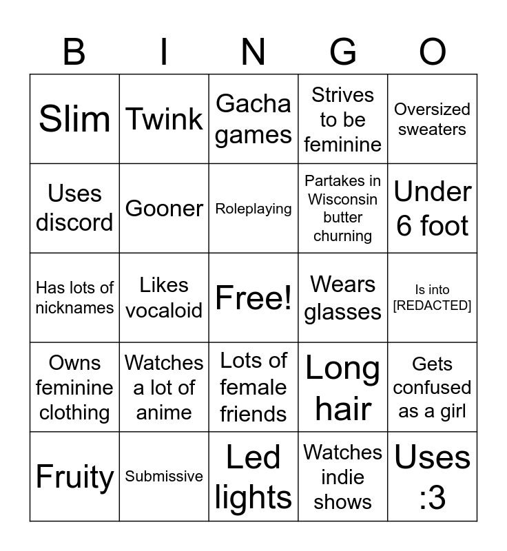 This bingo card has a free space and 24 words: Watches a lot of anime, Submissive, Roleplaying, Fruity, Oversized sweaters, Slim, Uses discord, Twink, Wears glasses, Lots of female friends, Partakes in Wisconsin butter churning, Has lots of nicknames, Long hair, Gets confused as a girl, Gooner, Watches indie shows, Is into [REDACTED], Gacha games, Under 6 foot, Likes vocaloid, Uses :3, Owns feminine clothing, Strives to be feminine and Led lights.