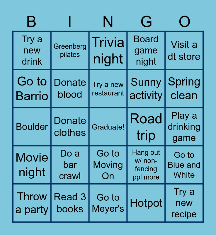 This bingo card has a free space and 24 words: Do a bar crawl, Read 3 books, Try a new restaurant, Throw a party, Visit a dt store, Try a new drink, Go to Barrio, Greenberg pilates, Road trip, Go to Moving On, Sunny activity, Boulder, Hang out w/ non-fencing ppl more, Go to Blue and White, Donate blood, Hotpot, Play a drinking game, Trivia night, Spring clean, Donate clothes, Try a new recipe, Movie night, Board game night and Go to Meyer's.