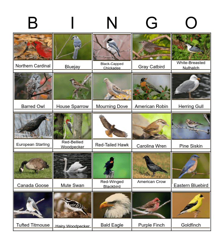 This bingo card has 27 images and 27 words: American Crow, Goldfinch, American Robin, Bald Eagle, Barred Owl, Black-Capped Chickadee, Bluejay, Canada Goose, Carolina Wren, Eastern Bluebird, European Starling, Gray Catbird, Tufted Titmouse, Hairy Woodpecker, Herring Gull, House Finch, House Sparrow, Mourning Dove, Mute Swan, Northern Cardinal, Pine Siskin, Purple Finch, Red-Bellied Woodpecker, Red-Tailed Hawk, Red-Winged Blackbird, White-Breasted Nuthatch and Turkey Vulture.