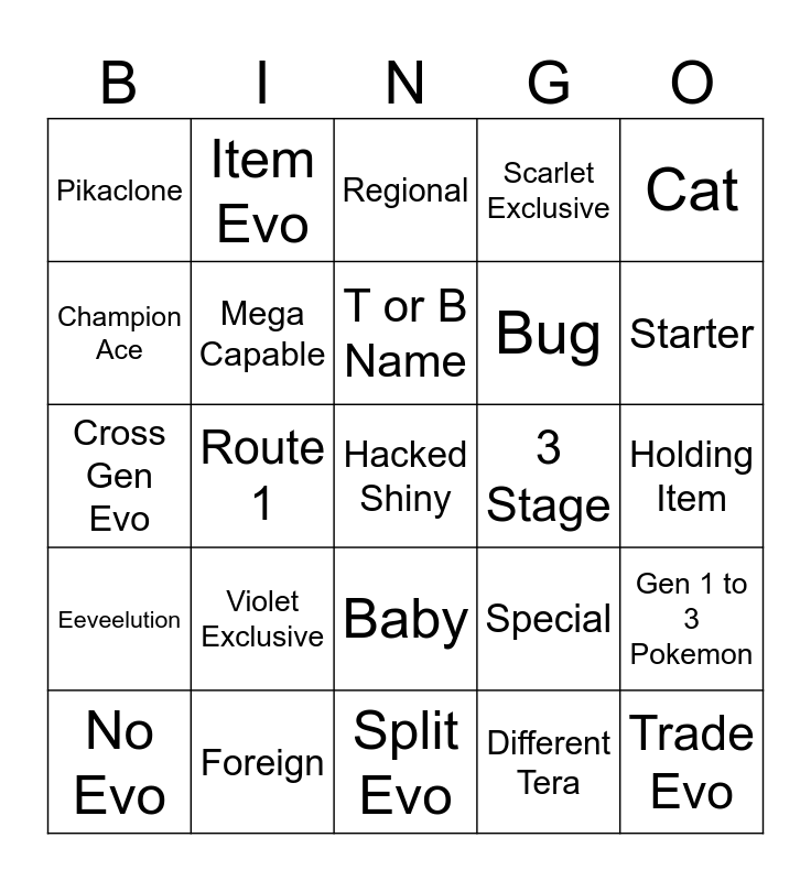 This bingo card has a free space and 24 words: Violet Exclusive, Foreign, T or B Name, No Evo, Cat, Pikaclone, Champion Ace, Item Evo, 3 Stage, Baby, Bug, Cross Gen Evo, Special, Gen 1 to 3 Pokemon, Mega Capable, Different Tera, Holding Item, Regional, Starter, Route 1, Trade Evo, Eeveelution, Scarlet Exclusive and Split Evo.