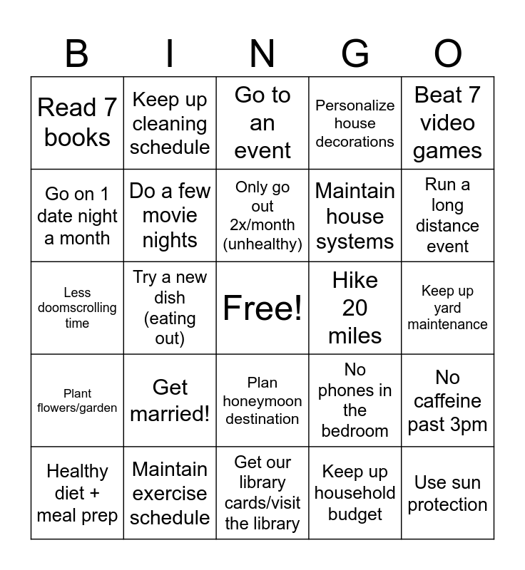 This bingo card has a free space and 24 words: Get married!, Maintain exercise schedule, Only go out 2x/month (unhealthy), Healthy diet + meal prep, Beat 7 video games, Read 7 books, Go on 1 date night a month, Keep up cleaning schedule, Hike 20 miles, Plan honeymoon destination, Maintain house systems, Less doomscrolling time, No phones in the bedroom, No caffeine past 3pm, Do a few movie nights, Keep up household budget, Keep up yard maintenance, Go to an event, Run a long distance event, Try a new dish (eating out), Use sun protection, Plant flowers/garden, Personalize house decorations and Get our library cards/visit the library.