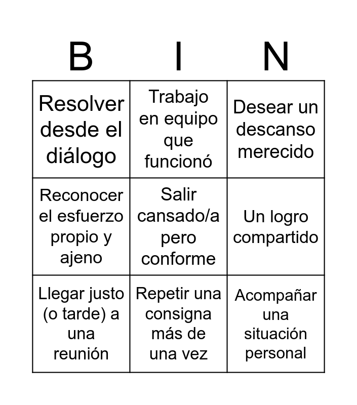 This bingo card has 53 words: Free!, Reunión que se extendió más de lo previsto, Improvisar una clase, Resolver un conflicto inesperado, Escuchar a un estudiante que lo necesitaba, Reorganizar horarios, Trabajo en equipo que funcionó, Cansancio… y seguir igual, Un logro compartido, Aprender algo nuevo, Llegar justo (o tarde) a una reunión, Cambiar una planificación a último momento, Resolver algo “rápido” que llevó mucho tiempo, Hacer varias cosas al mismo tiempo, Sentir que el día no alcanzó, Adaptar una actividad sobre la marcha, Repetir una consigna más de una vez, Celebrar un pequeño gran avance de un/a estudiante, Sentir orgullo por un grupo, Salir cansado/a pero conforme, Mediar en un conflicto, Escuchar más de lo previsto, Acompañar una situación personal, Resolver desde el diálogo, Pedir ayuda a un colega, Reorganizar horarios o espacios, Trabajar en equipo para resolver un problema, Cumplir una tarea administrativa extra, Adaptarse a una indicación nueva, Sostener acuerdos institucionales, Sentir cansancio acumulado, Sentirse acompañado/a, Dudar y seguir adelante, Terminar el día con satisfacción, Contar los días para el cierre, Hacer balances personales, Reconocer el esfuerzo propio y ajeno, Pensar “llegamos”, Desear un descanso merecido, Recibir un pelotazo, Estudiante que no lo vienen a retirar, “Gritar ‘¡tiempo!’ y que nadie pare.”, “Explicar una consigna mientras vuelan pelotas.”, “Llegar prolijo/a y terminar despeinado/a.”, “Decir ‘última vez’ más de una vez.”, “Hablar fuerte… y más fuerte.”, “Mostrar el ejercicio… y quedar sin aire.”, “Demostrar y pensar ‘ya no tengo 20’.”, “Correr sin saber por qué.”, “Pero salió bien.”, Compartir almuerzos con los compañeros, Compartir mates con los compañeros and Ya me conocen....