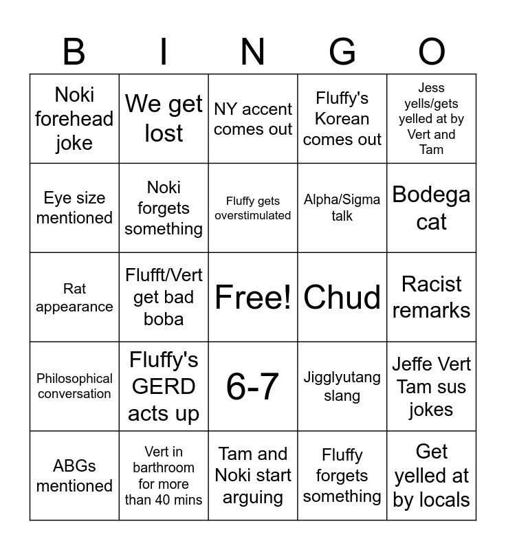 This bingo card has a free space and 24 words: Fluffy's GERD acts up, Vert in barthroom for more than 40 mins, Fluffy gets overstimulated, ABGs mentioned, Jess yells/gets yelled at by Vert and Tam, Noki forehead joke, Eye size mentioned, We get lost, Chud, 6-7, Alpha/Sigma talk, Rat appearance, Jigglyutang slang, Jeffe Vert Tam sus jokes, Noki forgets something, Fluffy forgets something, Racist remarks, NY accent comes out, Bodega cat, Flufft/Vert get bad boba, Get yelled at by locals, Philosophical conversation, Fluffy's Korean comes out and Tam and Noki start arguing.