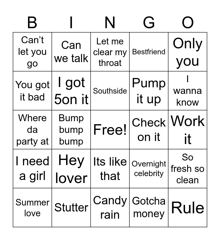 This bingo card has a free space and 24 words: Hey lover, Stutter, Southside, Summer love, Only you, Can’t let you go, You got it bad, Can we talk, Check on it, Its like that, Pump it up, Where da party at, Overnight celebrity, So fresh so clean, I got 5on it, Gotcha money, Work it, Let me clear my throat, I wanna know, Bump bump bump, Rule, I need a girl, Bestfriend and Candy rain.