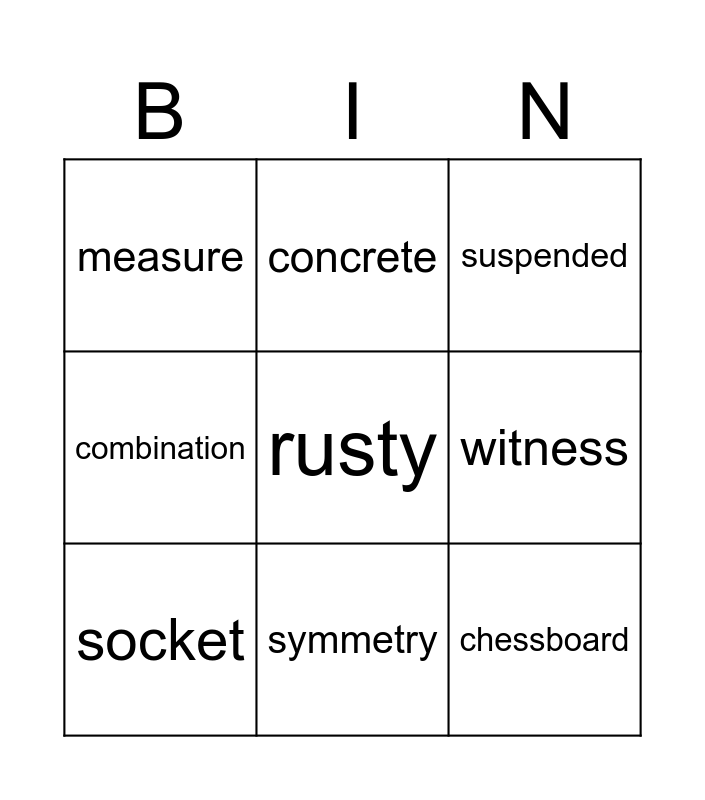 This bingo card has a free space and 11 words: afford, symmetry, chessboard, socket, concrete, suspended, witness, horizon, combination, measure and shadow.