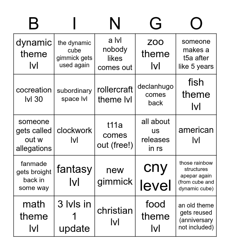 This bingo card has a free space and 24 words: fantasy lvl, 3 lvls in 1 update, rollercraft theme lvl, math theme lvl, someone makes a t5a after like 5 years, dynamic theme lvl, cocreation lvl 30, the dynamic cube gimmick gets used again, all about us releases in rs, new gimmick, declanhugo comes back, someone gets called out w allegations, cny level, those rainbow structures apepar again (from cube and dynamic cube), subordinary space lvl, food theme lvl, american lvl, a lvl nobody likes comes out, fish theme lvl, clockwork lvl, an old theme gets reused (anniversary not included), fanmade gets broight back in some way, zoo theme lvl and christian lvl.