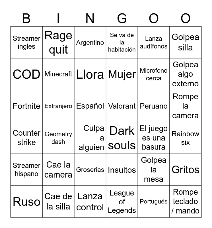 This bingo card has 36 words: Insultos, Groserias, League of Legends, COD, Counter strike, Valorant, Minecraft, Lanza control, Lanza audífonos, Golpea la mesa, Golpea algo externo, Se va de la habitación, Gritos, Extranjero, Mujer, Streamer ingles, Streamer hispano, Peruano, Fortnite, Argentino, Español, Geometry dash, Dark souls, Culpa a alguien, El juego es una basura, Rage quit, Microfono cerca, Cae de la silla, Llora, Golpea silla, Rompe teclado / mando, Ruso, Rainbow six, Rompe la camera, Cae la camera and Portugués.