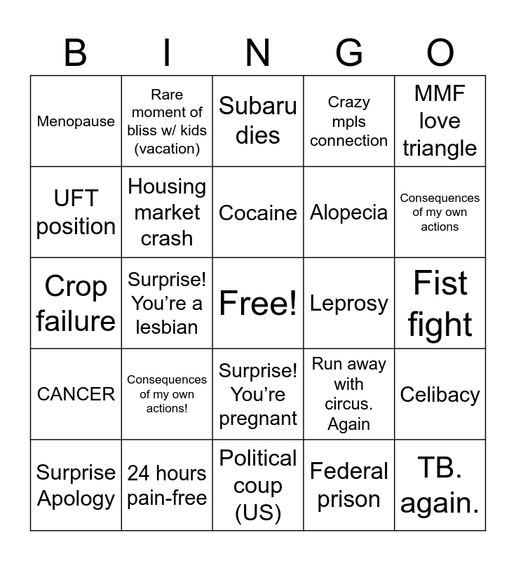 This bingo card has a free space and 24 words: Consequences of my own actions!, 24 hours pain-free, Cocaine, Surprise Apology, MMF love triangle, Menopause, UFT position, Rare moment of bliss w/ kids (vacation), Leprosy, Surprise! You’re pregnant, Alopecia, Crop failure, Run away with circus. Again, Celibacy, Housing market crash, Federal prison, Fist fight, Subaru dies, Consequences of my own actions, Surprise! You’re a lesbian, TB. again., CANCER, Crazy mpls connection and Political coup (US).